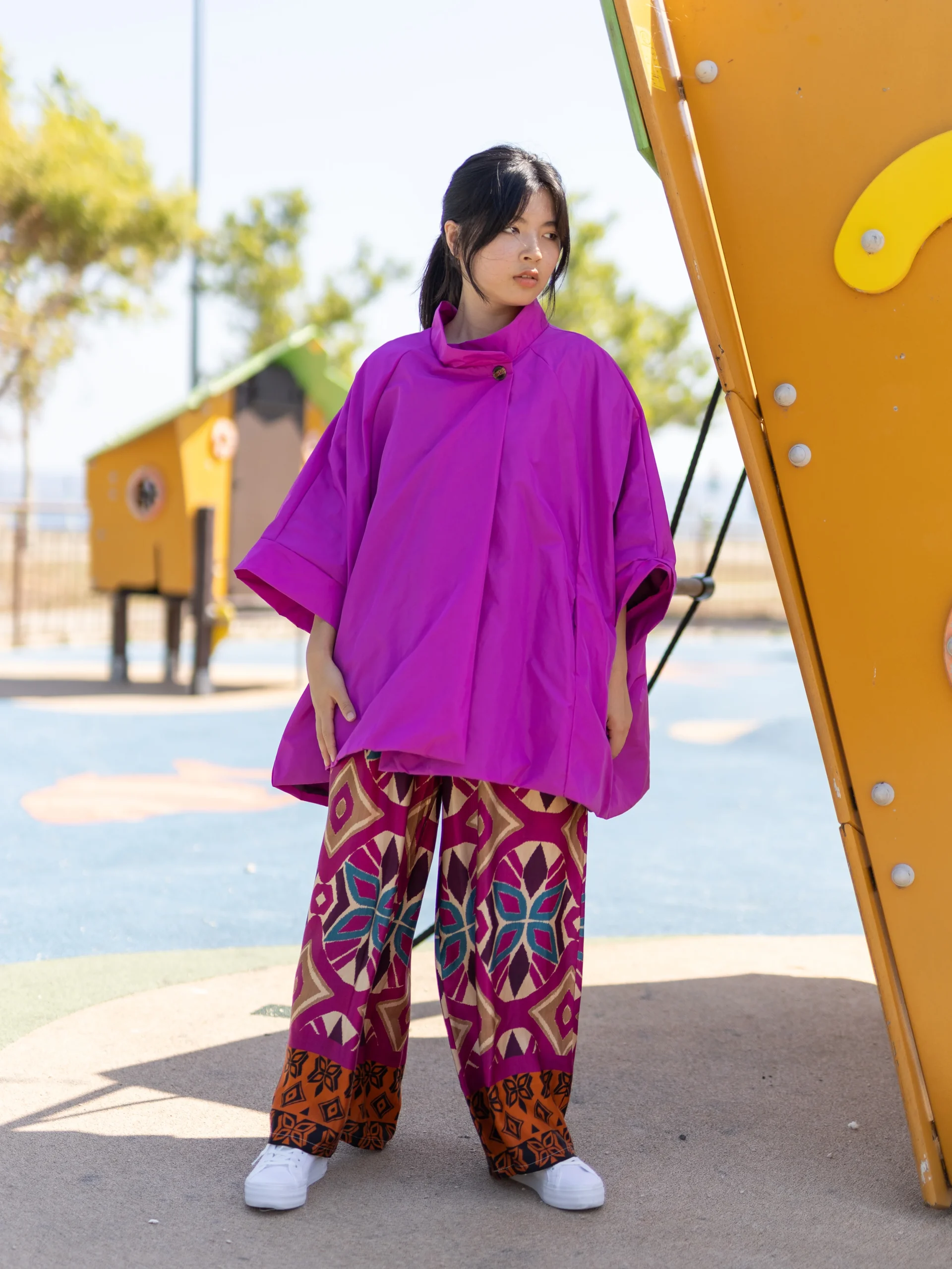 Sa coupe ample et fluide assure un confort optimal et une grande liberté de mouvement, tandis que le col montant se ferme par un bouton raffiné pour une touche de style subtile. Sa matière déperlante protège efficacement contre l’humidité tout en restant légère et agréable à porter.