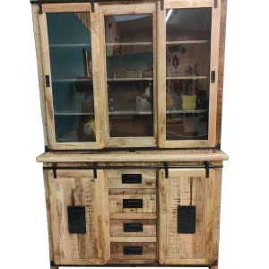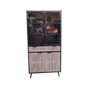 MEUBLE HAUT VITRINE MANGUIER ET METAL 2 PORTES VITREES 2 PORTES 90 X 40 X 180