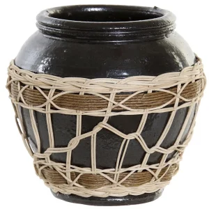 VASE TERRE CUITE ET ROTIN ESPRIT ETHNIQUE 18.5 X 18.5 X 18 CM
