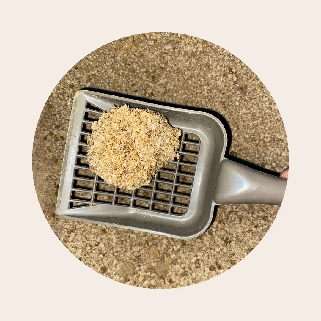 - Retirez régulièrement à l’aide d’une pelle les granulés saturés et les excréments solides, et rajoutez la quantité de litière végétale manquante,