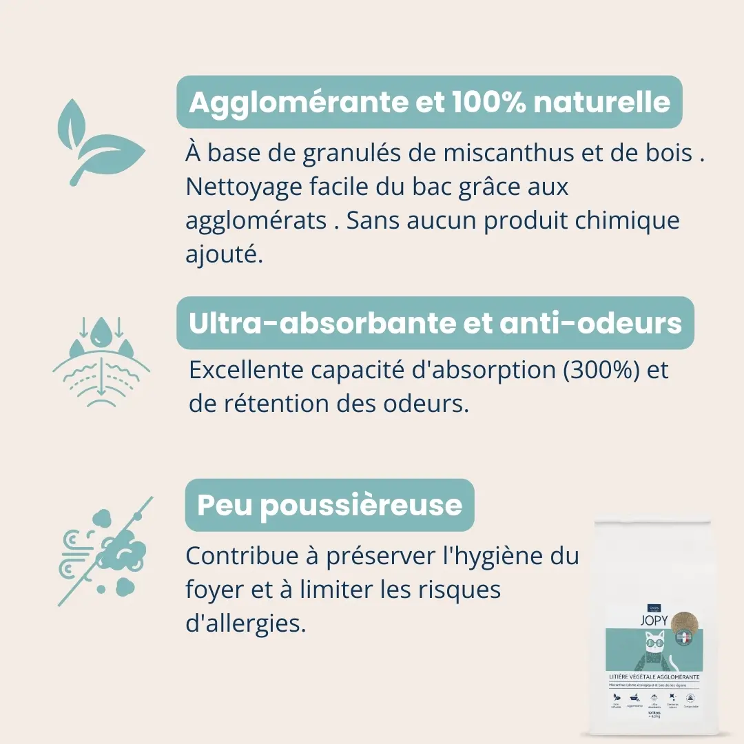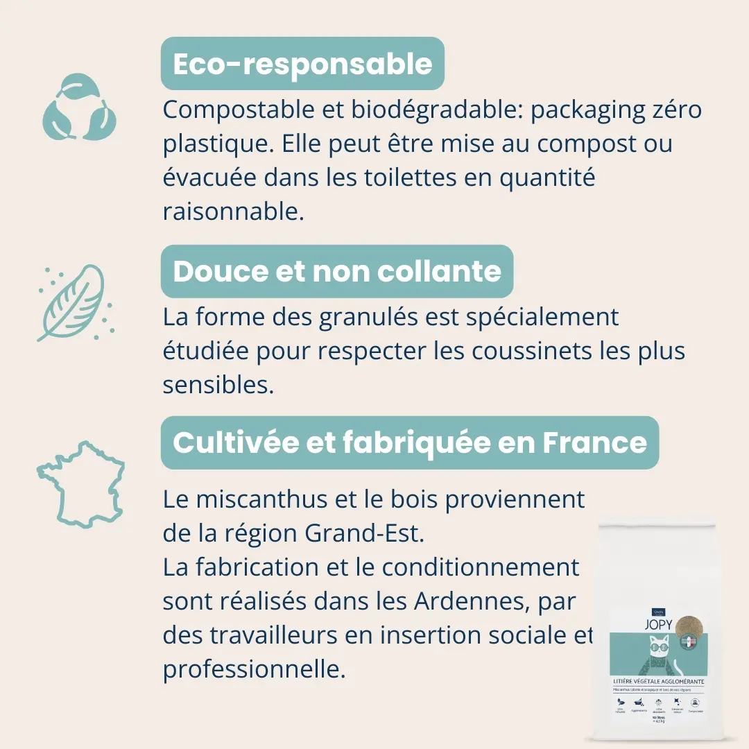La litière agglomérante végétale Jopy est fabriquée à partir d’un mélange naturel élaboré pour offrir une performance et une qualité optimales tout en réduisant le gaspillage des ressources. Conçue avec du miscanthus, une plante écologique, et du bois provenant de la région Grand Est, elle présente des propriétés agglomérantes et une capacité d’absorption exceptionnelle (300%). En plus de contrôler les odeurs, elle est également très douce pour les pattes des chats.